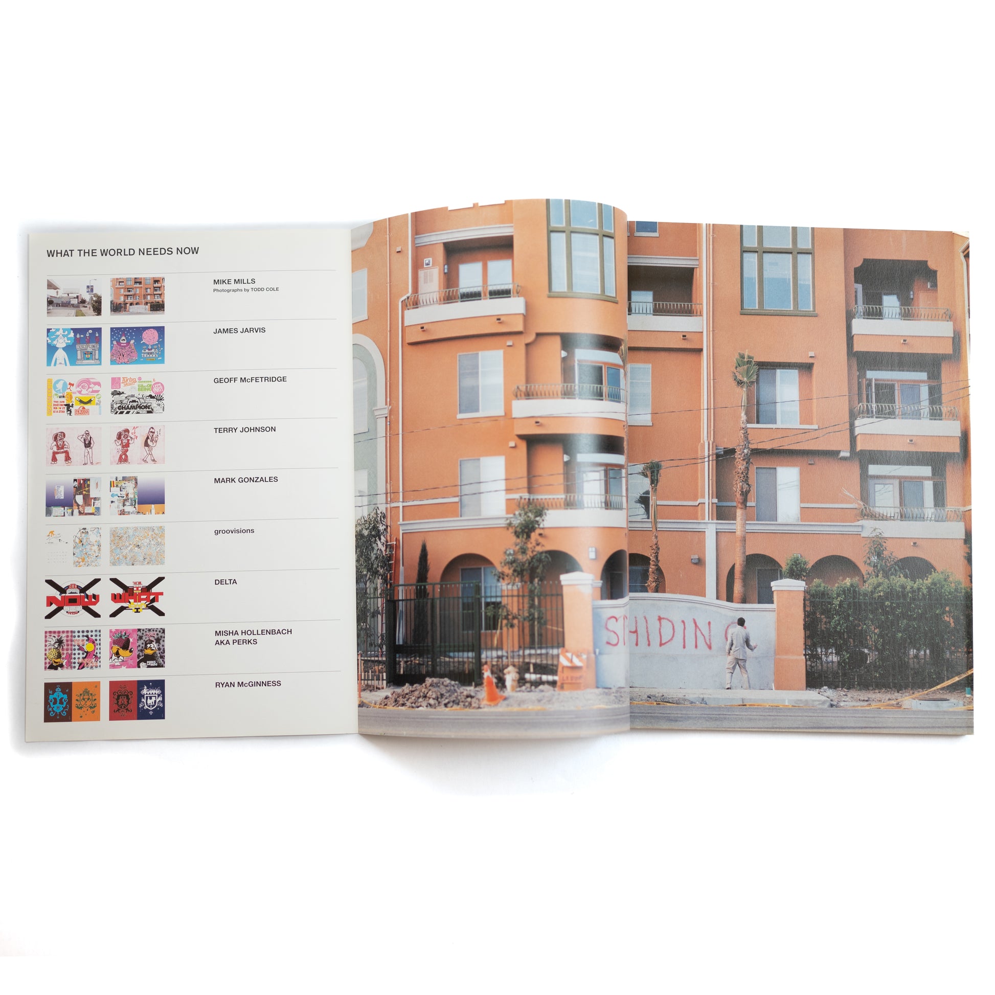 "What The World Needs Now" art feature with contributions from Groovisions, Misha Hollenbach (P.A.M), Mark Gonzales and more. Hitoshi Matsumoto interview.